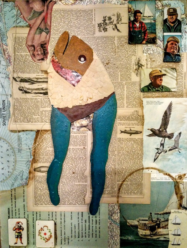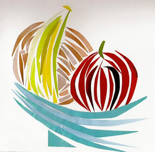 Messing around with how to show dimension and depth in a collage. It’s a bowl of fruits. But they’re made of paper and glue so they probably wouldn’t taste very good.