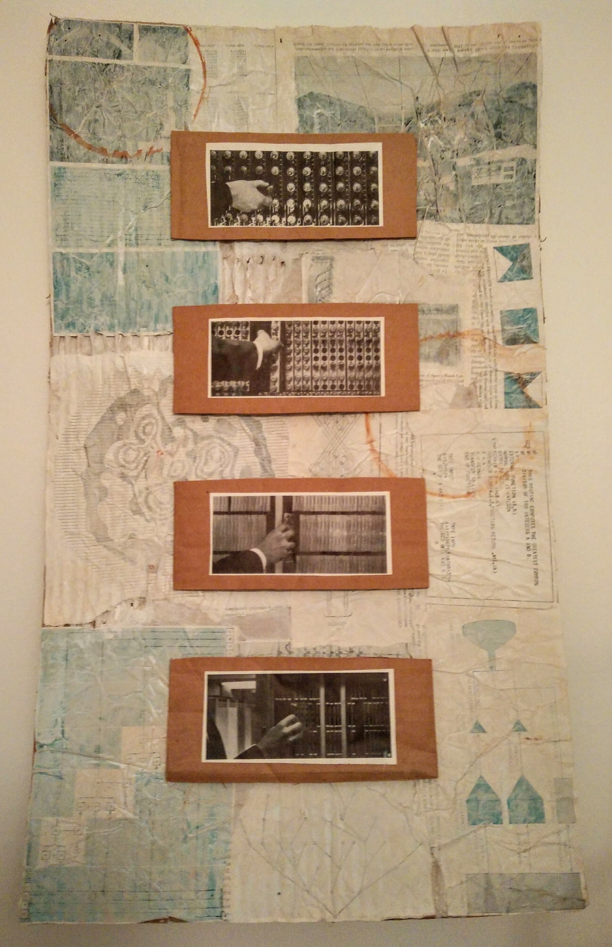 Technology is pretty neat and scary. Lots of magazine clippings, acrylics, and plastic shell over the light bulb to give it some reflection and weird texture.
