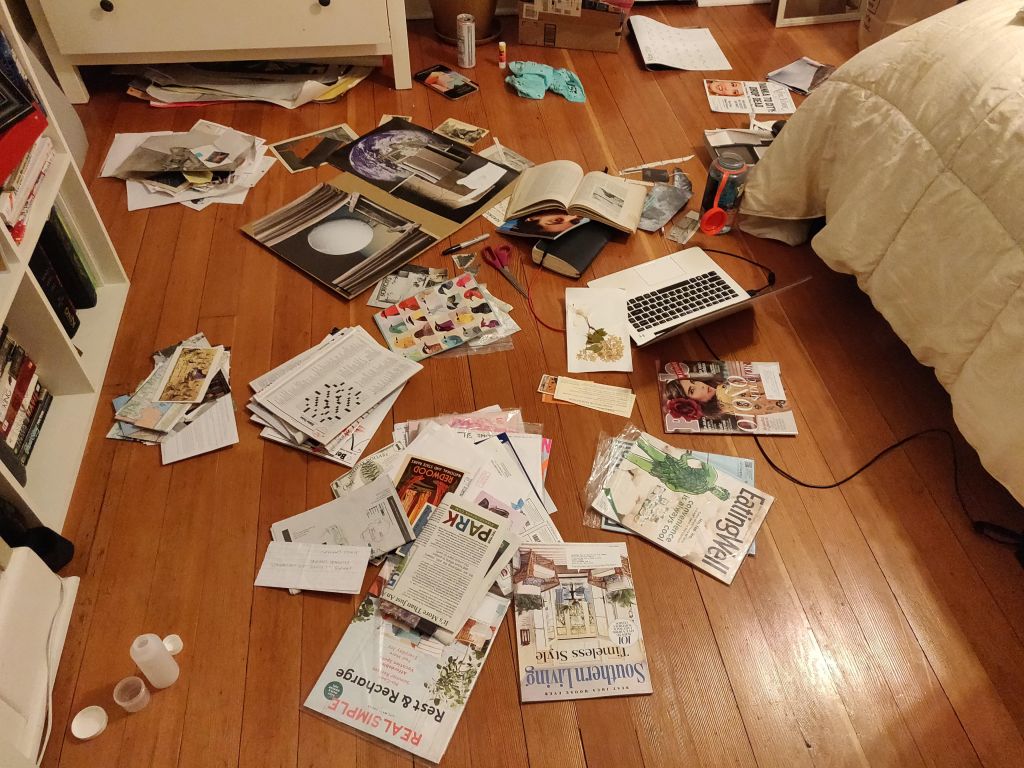 This is what my space looked like when I was half finished with the first piece I was working on. Had to keep migrating around the room, because there were so many scraps of paper everywhere. Or maybe I have a Pretty Bits of Paper hoarding problem.
