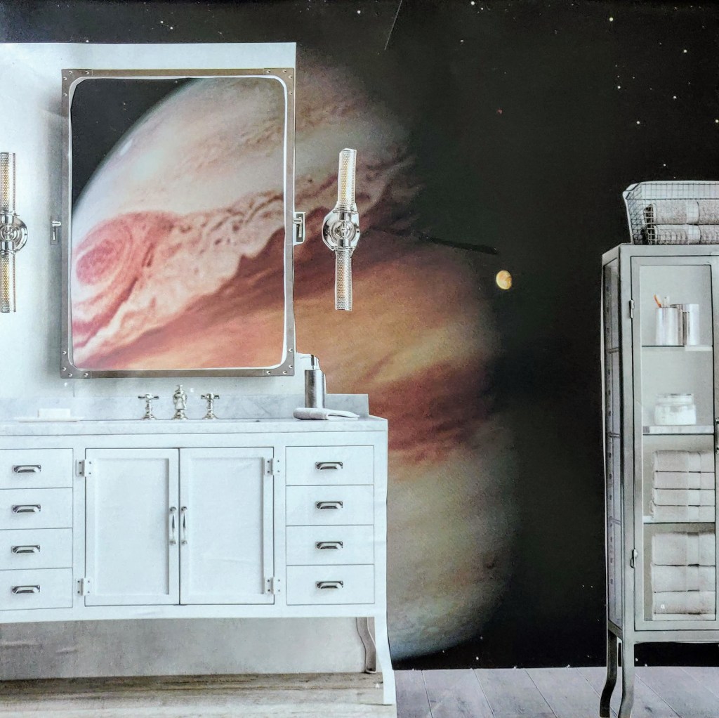 Full bath with a stunning view of the great storm of Jupiter. With this view, you will be excited to excuse yourself from company!